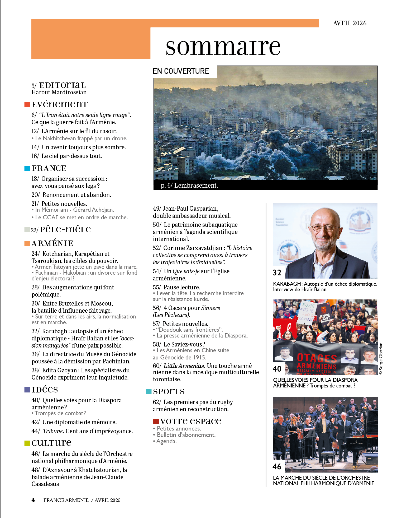 En ce mois d’avril, France Arménie fête ses 44 ans, et reste le plus ancien journal arménien en activité de la Diaspora française. Au moment où vous allez ouvrir ce magazine chez vous, je vous invite, si vous avez un ordinateur, une tablette ou votre téléphone, à vous rendre sur le site france-armenie.fr. En effet, comme nous nous y étions engagés, notre site a fait peau neuve. Vous y retrouverez les articles parus depuis le début de l’année dans la version papier. Nos archives aussi ont été totalement numérisées grâce à votre soutien financier et vont s’insérer prochainement dans ce nouveau site. Tout en conservant notre version papier, vous pourrez retrouver sur le site france-armenie.fr, chaque jour, chaque semaine, des articles d’analyse et de décryptage de l’actualité arménienne faisant plus que jamais de France Arménie, le lien précieux entre tous les Arméniens. Mais, vous le savez, l’actualité de qualité a un coût et dans un contexte économique compliqué et la baisse des recettes publicitaires, plus que jamais nous avons besoin de vous car nous ne voulons pas voir s’arrêter la formidable aventure que constitue France Arménie. Face aux fake news, à l’IA, à tous les faux comptes sur les réseaux sociaux qui distillent quotidiennement la haine et le mensonge, les médias comme le nôtre sont, eux, périssables. Aussi, nous comptons sur vos abonnements, vos publicités et surtout sur vos dons pour pérenniser ce magazine et désormais sa version en ligne. Ce constat est d’autant plus vrai quand on regarde le climat délétère dans lequel l’Arménie sombre chaque jour, quand on voit les reculs de la Cause arménienne comme par exemple le licenciement d’Edita Gzoyan, la directrice du Musée du Génocide de Dzidzernagapert, pour avoir remis un livre sur l’Artsakh à JD Vance. Car dans cette Arménie, il ne faut plus prononcer le mot Artsakh, ne plus regarder l’Ararat, ne plus être fier de son histoire millénaire. Au contraire, il faut dénigrer son Eglise, sa Constitution, ses journalistes, ses chercheurs… Dans cette « Arménie réelle », on peut s’attendre à tout et notamment à un usage immodéré et partisan de la Justice pour régler des comptes avec ses opposants et se maintenir au pouvoir sous le regard bienveillant de l’Europe. On peut donc envisager, sans trop se tromper, que tout sera mis en œuvre pour assurer la victoire du pouvoir en place, au nom de la paix et de la démocratie. Tout cela pour plaire et complaire à la Turquie et à l’Azerbaïdjan pour une paix dont on sait qu’elle n’est pas garantie car aucun garant, pas même Trump et encore moins Macron, ne se portera au secours de l’Arménie si elle devait être menacée. L’Iran, le Liban, la Syrie, le Vénézuela, l’Ukraine, Gaza et la Palestine sont des exemples frappants que l’ordre mondial est en train de vaciller et qu’il faut se préparer à toutes les éventualités. En ce sens, l’Arménie et l’Artsakh ont servi de terrains de tests pour ce que nous voyons aujourd’hui. A partir du moment où l’Azerbaïdjan use de la force pour procéder à un nettoyage ethnique, un génocide, sans que la communauté internationale ne bouge le petit doigt, n’impose des sanctions et qu’elle se contente de promettre de l’aide humanitaire tout en faisant le commerce du gaz et du pétrole avec le bourreau d’un peuple, pourquoi en serait-il autrement pour ces autres pays, ces autres peuples ? Deux choix s’offrent désormais à nous, Arméniens de France : marcher la tête baissée, courber l’échine ou marcher la tête haute, continuer à revendiquer inlassablement « Justice pour le peuple arménien », être solidaire de sa Mère Patrie et œuvrer pour son indépendance et sa sécurité. Les commémorations du 24-Avril prochain nous donneront de nouveau l’occasion de répondre à ce choix. Il y aura ceux qui resteront chez eux à commémorer intérieurement et il y aura, nous l’espérons, la très grande majorité qui participera activement pour que vive la Cause arménienne.